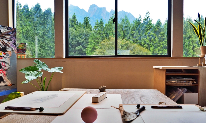 自然光がたっぷり入る妙義アートハウス。窓からは妙義山が見える。