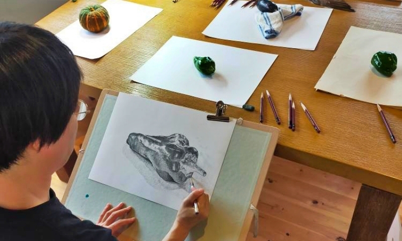 鉛筆の正しい持ち方、 鉛筆の硬さ・柔らかさの使い分けといった、デッサンの基本の“き”から学びます。経験に応じて難易度を上げていくことができます。