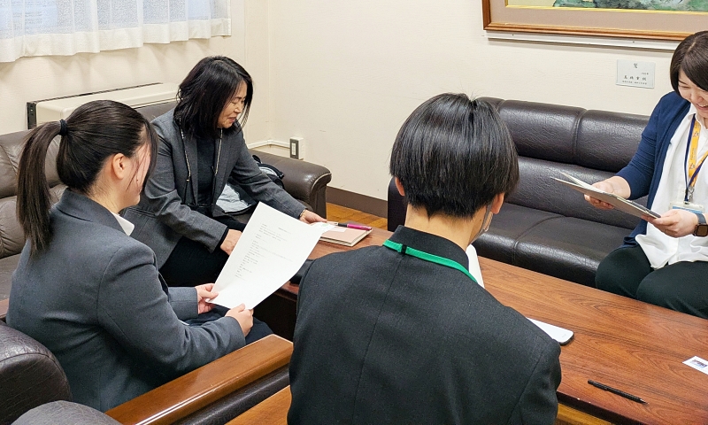市役所の一室でミーティング。生徒たちは学校外での社会活動を楽しんでいる様子です。